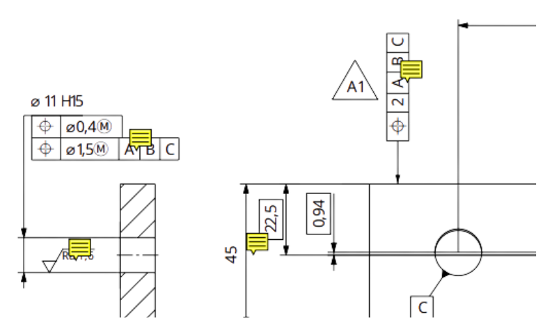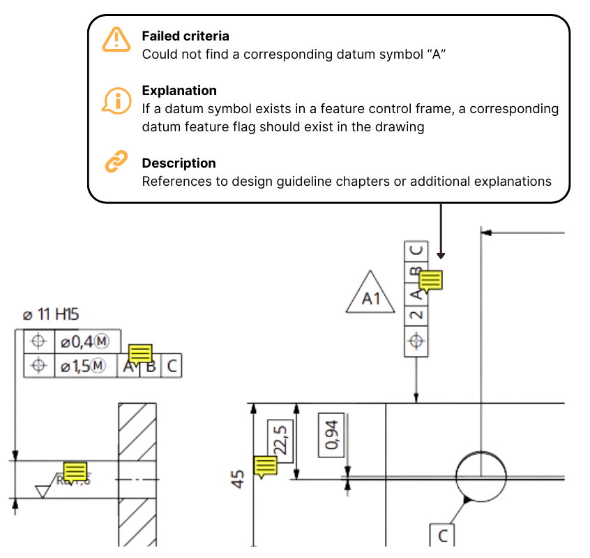 Vårt AI-system kan även granska geometriska form-och lägestoleranser (GD&T) på era ritningar och kontrollera att de följer era uppsatta standarder och krav. I samråd med våra kunder jobbar vi kontinuerligt på att utöka stödet till fler delar av ISO GPS och ASME Y14.